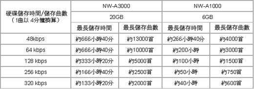 在MP3或是ATRAC的128kbps模式下,畫面表示設定為15秒時,NW-A3000約為29小時,NW-A1000約為17小時
